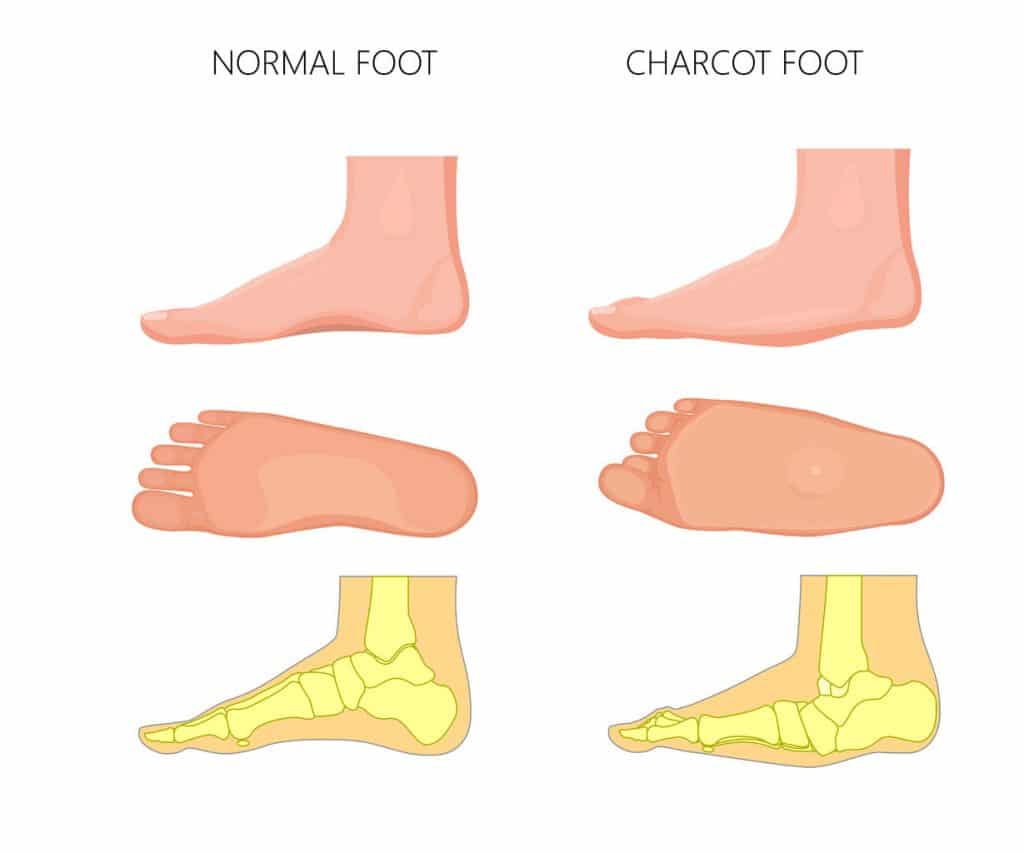The weakening of the bones and the lack of sensation are the amplifiers of Charcot foot. This disease weakens the bones in the foot, so it’s more common for a sprain, fracture, dislocation, etc., to occur. Neuropathy decreases the ability to feel an injury and a bone break or severe sprain. As one continues to put pressure on the damaged foot, neuropathy prevents the affected person from being aware anything is wrong, and further damage occurs.